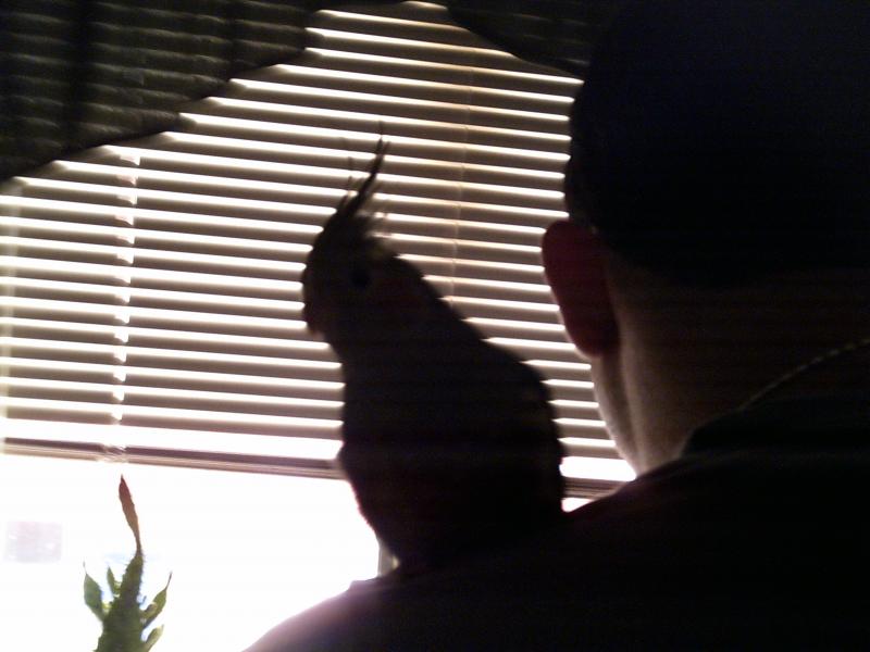This is Ruby on David's shoulder. I didn't want to startle her with the flash so we have a silhouette of her - she is adorable and has beautiful colors and really enjoys being out of her cage and walking on Dave's shoulder.